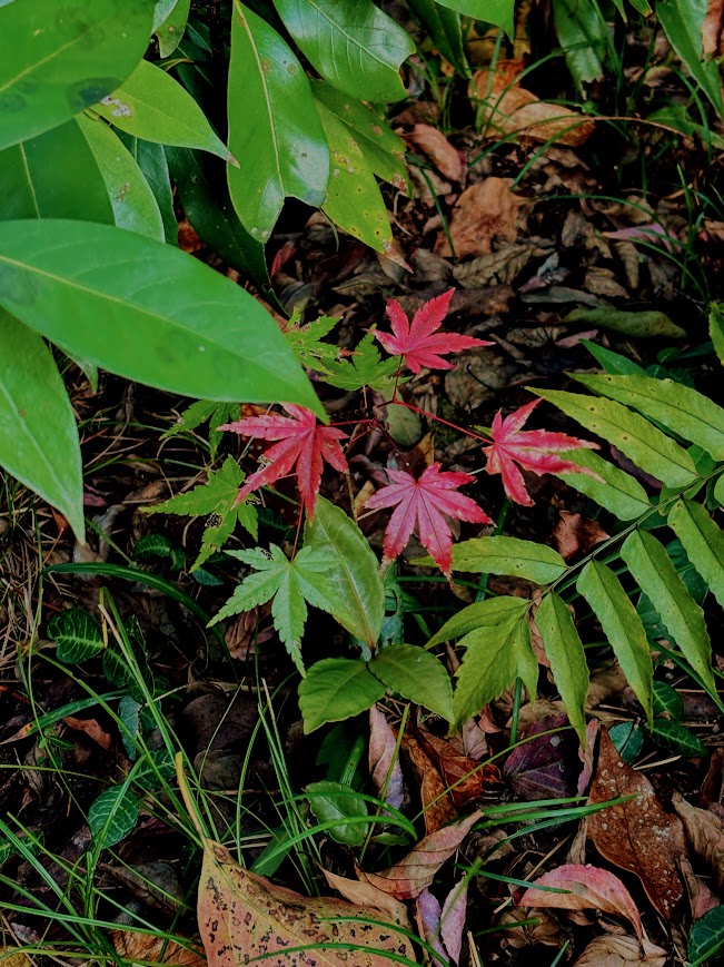 天気予報通りに昨日までの暖かさから今日は風の冷たい日となりました。庭の樹々の紅葉も色濃くなりヒビコレの秋も深まってきました。お天気が良く過ごしやすかったこの間の日曜日にヒビコレで集まりがありました。一年半ほど続いたオンライン読書会の初めてのオフ会でした。読書会のテーマ本であった『植物のスピリット・メディスン』の翻訳者である会主催の方と横浜から参加の方。3名の小さな集いでしたが、持ち寄りランチとお茶タイムを楽しみあっという間に数時間が過ぎてしまいました。リアルにお会いするのが初めてでも同じ価値観の世界を共有してきたからでしょうか、昔からの友人であるような感覚で話が弾みました。今回都合のつかなかったメンバーもまた集まれると良いなと思います。写真はこぼれ種のもみじ。こんなに小さくても紅葉しているのが可愛い。